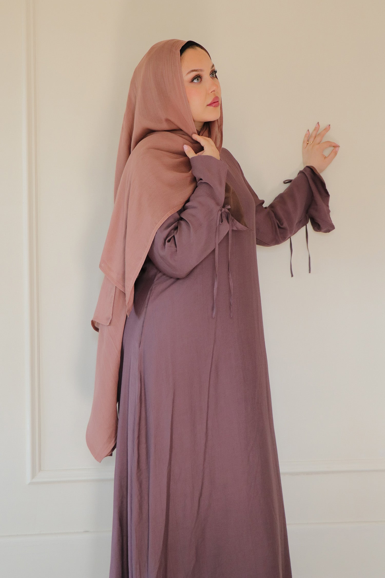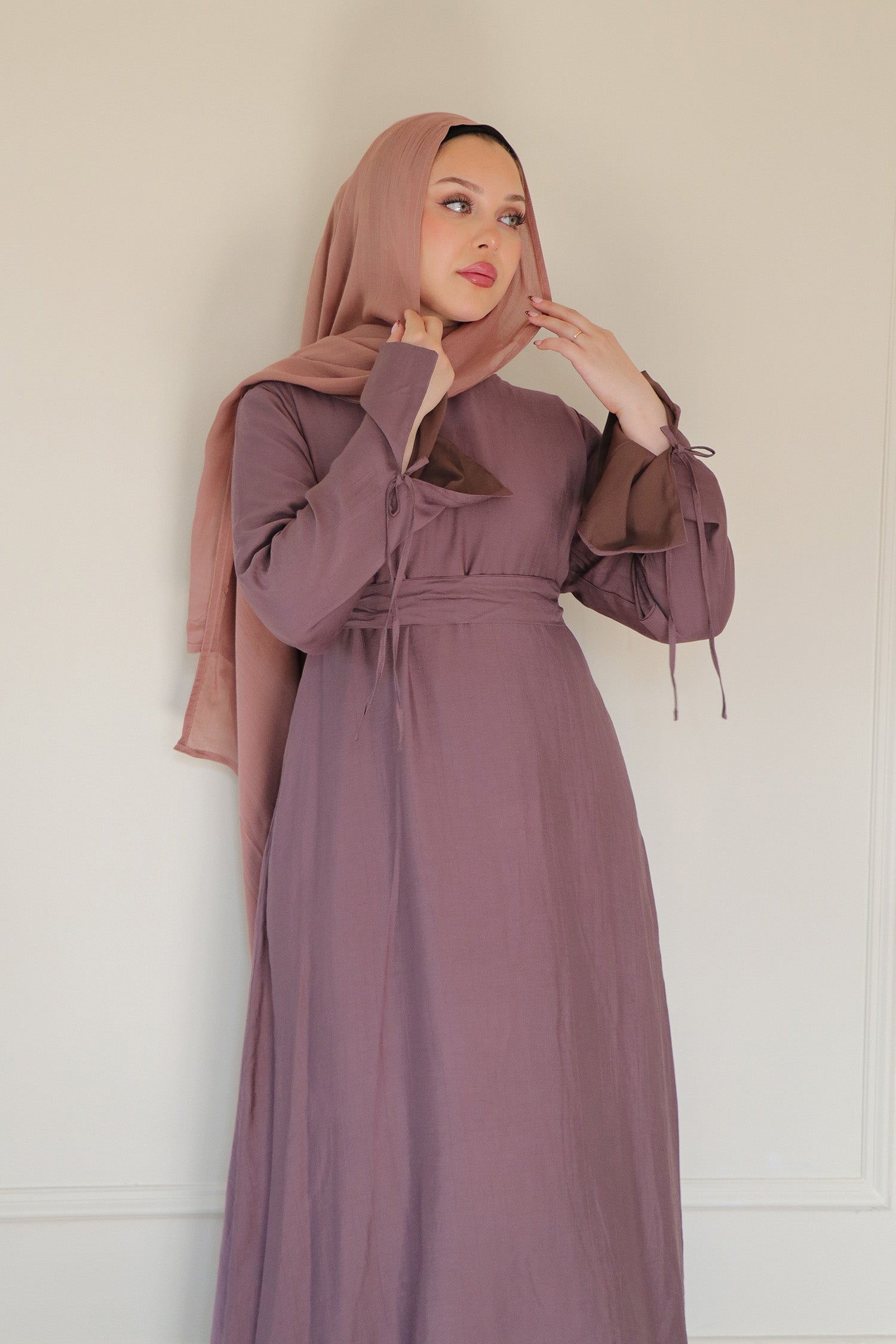 This elegant dress is crafted from high-quality textured fabric, offering both style and comfort. The sheath fit and separate belt provide flexibility, allowing you to wear the dress in many ways while maintaining a modest look. Its wide sleeves with delicate slits and charming ties offer a feminine touch, giving you the freedom to style them to suit your unique taste. Whether for casual settings or dressed-up events, the comfortable fabric ensures you feel at ease throughout the day.