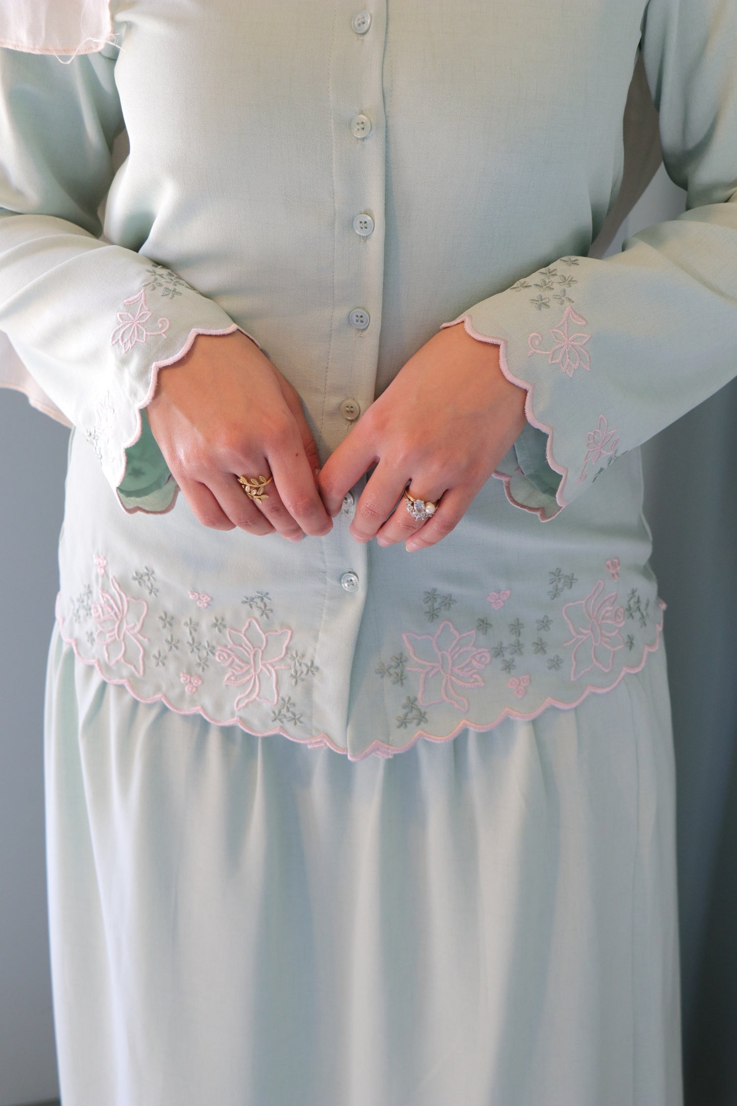 Made from lightweight linen fabric, it feels breathable and comfortable while keeping a structured, modest look. The top features a classic button-down front with a relaxed fit, giving it a clean and timeless style. Delicate floral embroidery runs along the hem and sleeves, adding a subtle feminine detail without overpowering the design. The scalloped edges at the cuffs and bottom of the top give it a soft, graceful finish.