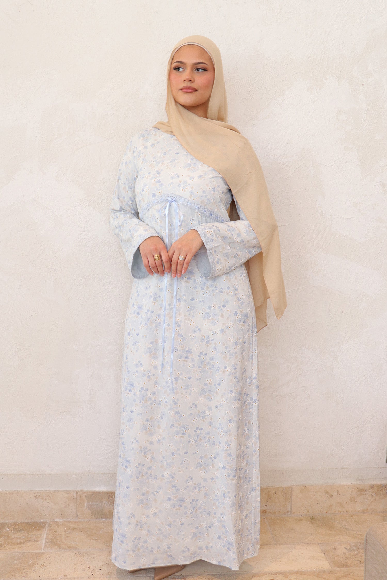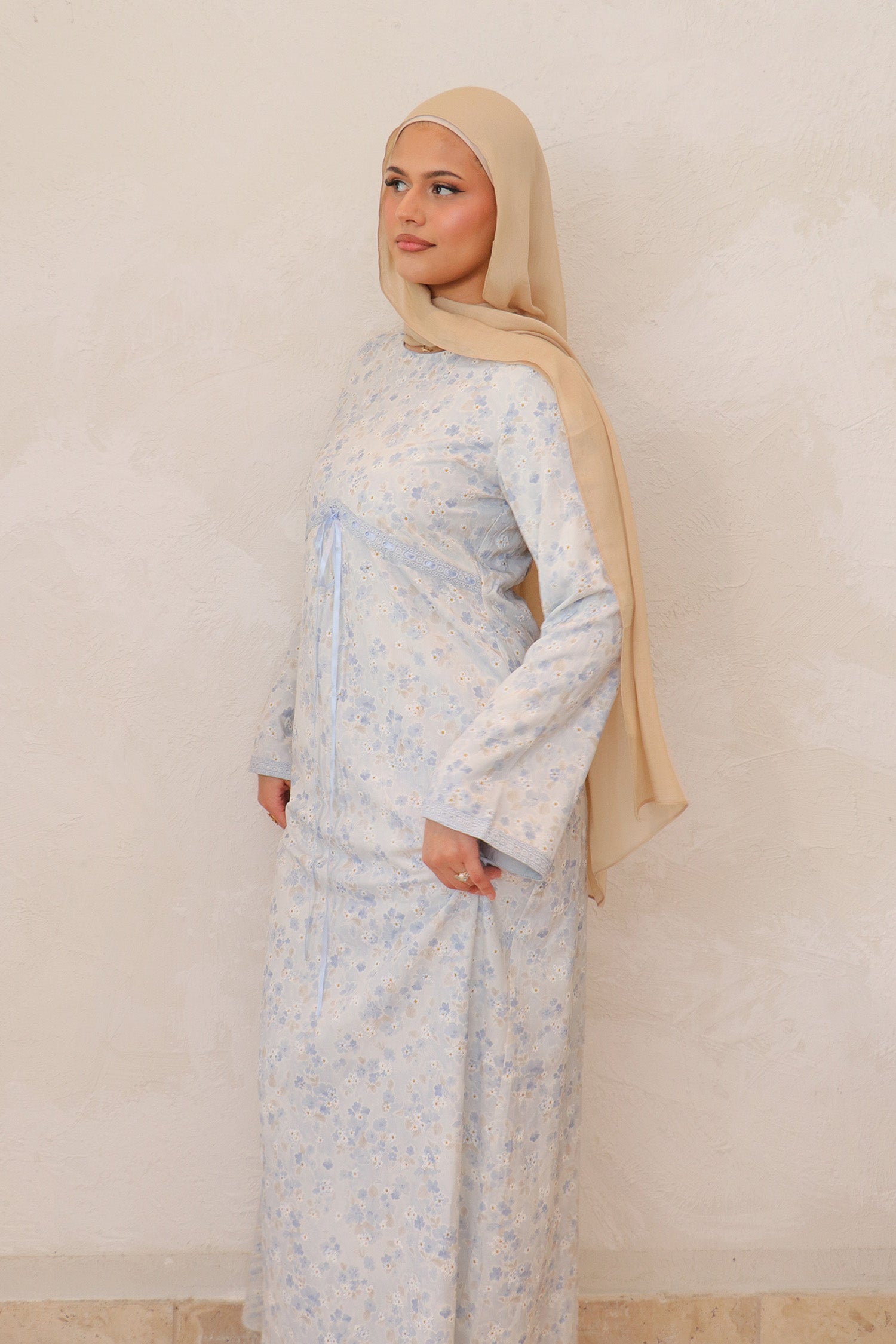 This lovely Evelyn Tie Maxi dress is soft, feminine, and easy to wear. Made from lightweight floral fabric, it features delicate trim detailing along the waist and sleeves for a subtle, pretty touch. The waist includes adjustable ties, allowing you to shape it comfortably while keeping a relaxed and modest fit.