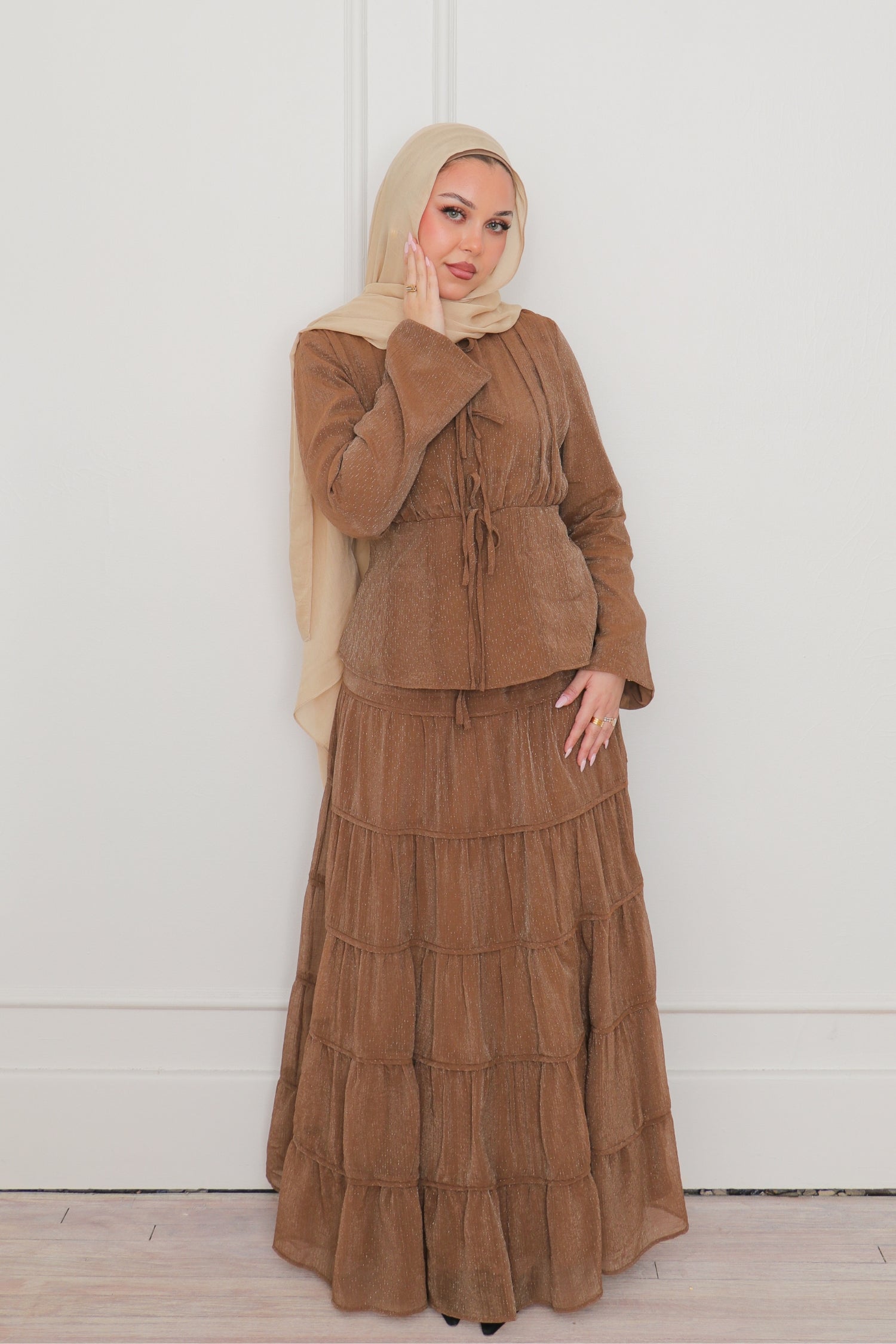The Nisa Maxi Set exudes elegance and femininity with its delicate details and flattering silhouette. The top features charming bows at the center, soft side pleats, and a cinched waistline for a graceful touch. Flowing sleeves add an extra hint of sophistication. The smocked, flurry maxi skirt is adjustable, allowing for a customized fit while enhancing movement and comfort. Crafted from airy floral chiffon, this set is perfect for special occasions, combining modesty with timeless charm.