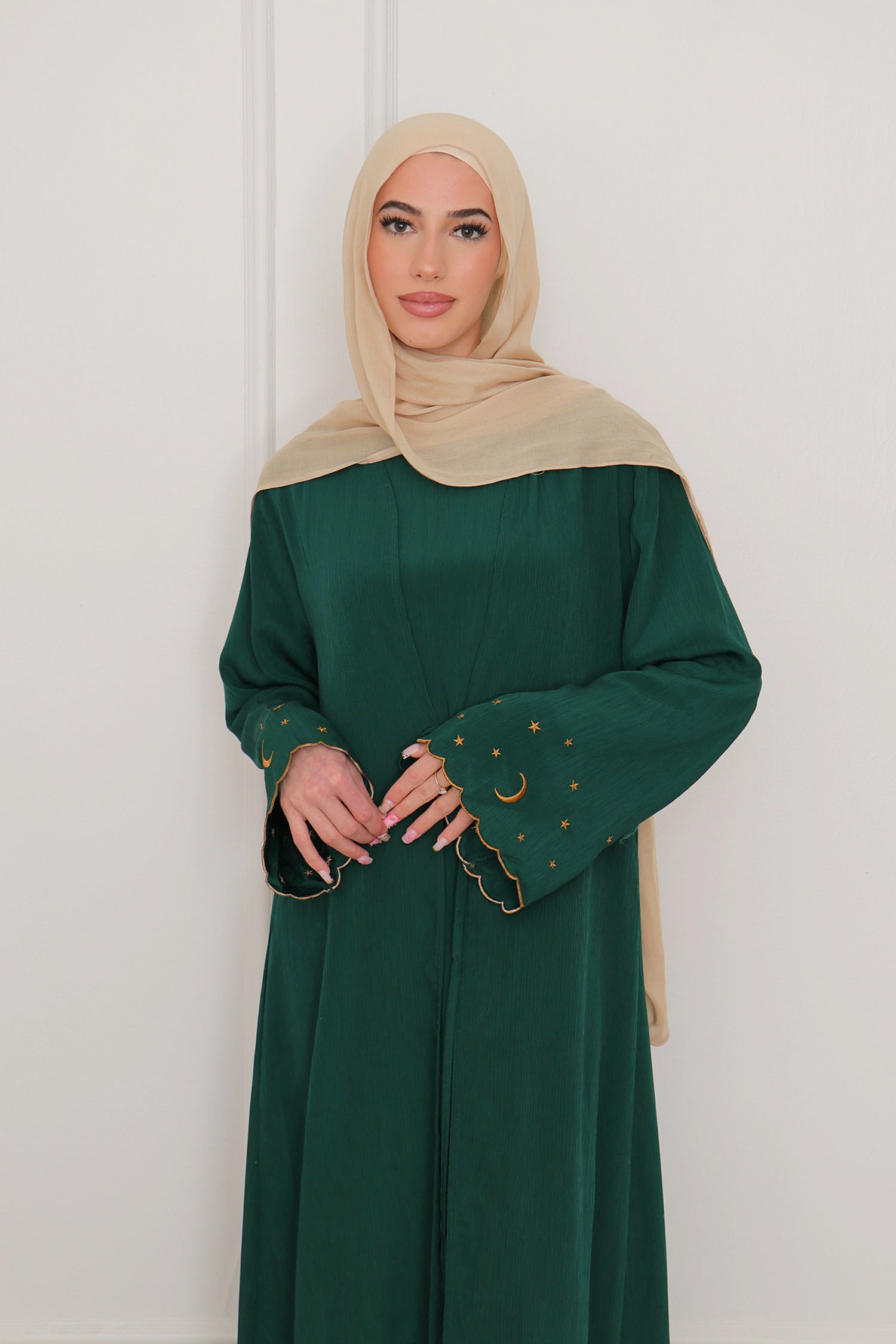 Introducing our enchanting 2-piece Abaya Set, a timeless addition to your modest wardrobe. The open abaya features a captivating design, with an elegant self-tie at the center, wide sleeves, and embellished embroidery on the sleeves makes it a true standout.