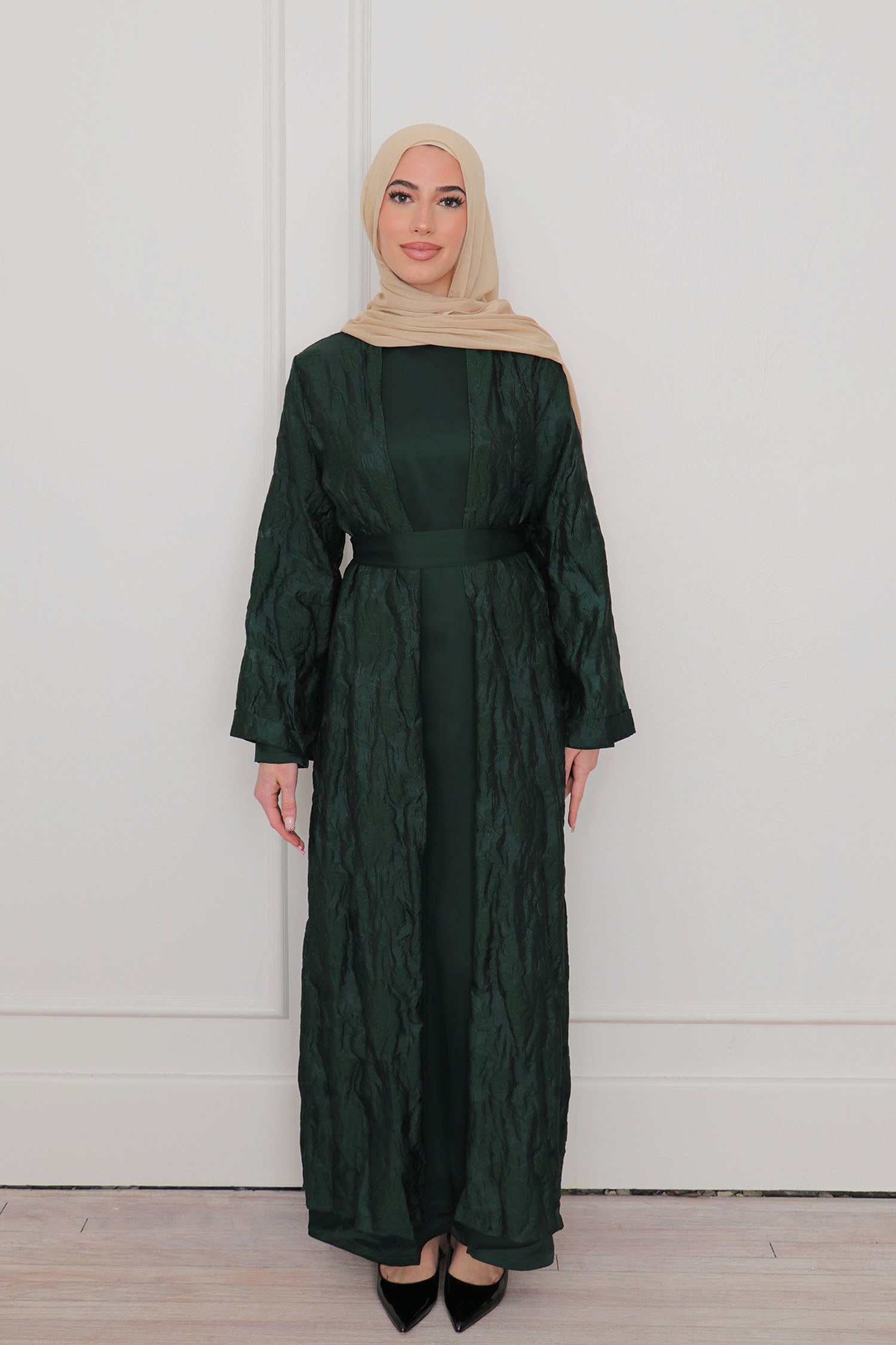 An alluring 2-piece Abaya Set perfect for special occasions and a staple addition to your modest wardrobe. Featuring an open Kimono abaya and inner tie wrap dress. The elegant inner tie wrap dress is cut for a loose fit and can be adjusted in various ways to achieve the perfect fit. The special set is made of a luxurious satin fabric with a stunning shine for an abaya set. A comfortable yet stylish abaya set for Eid holiday, wedding, and more events.